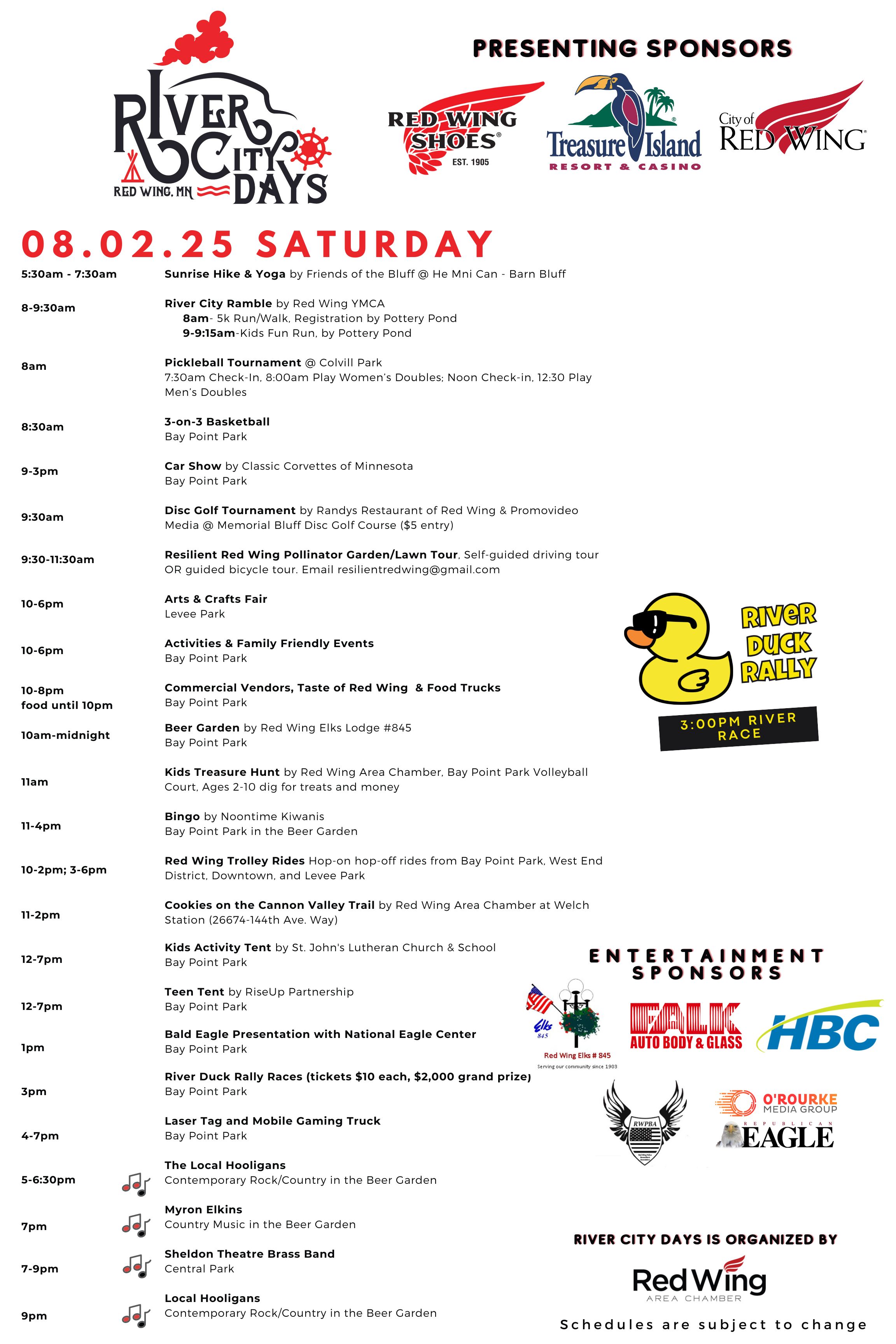 Laser Tag, Mobile Gaming Truck, Water Wars, Rock Climbing Wall, Teen Tent, Bald Eagle Program (Sat. 1pm), Archaeological Dig Boxes Sponsor – Goodhue Cty. Historical Society, Axe Throwing, Bungee Trampoline, Bounce Houses/Inflatables, City Activities & Crafts Sponsor – City of Red Wing, Dunk Tank Sponsor – Red Wing Royal Ambassadors & Red Wing Swim Club, Spin Art w/ Red Wing Arts, Fire Safety and Education Sponsor – Red Wing Fire Department, Goodhue County Sheriff Department Exhibits, Kiddie Train Rides, Kids Activity Tent Sponsor – St. Johns Lutheran Church and School & Red Wing Chamber, Kids Treasure Hunt (Sat. 10am) Sponsor – Red Wing Area Chamber, Mini Golf, Red Wing Soccer Club, Hole in One Contest, Red Wing Trolley Rides (From Bay Point Park to Levee Park), River City Ramble Kids Run (Sat. 9am), AND MORE!!